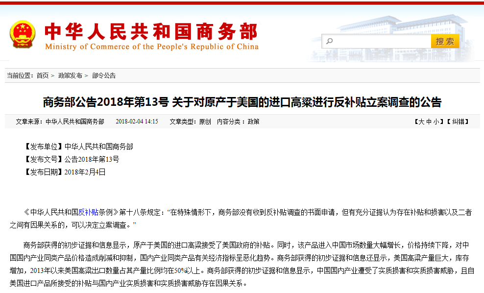 刚刚,忍无可忍之后,中国也对美国重拳出击了。2月4日,中国商务部发布2018年第12号和第13号公告,对美国高粱发起反倾销和反补贴立案调查。