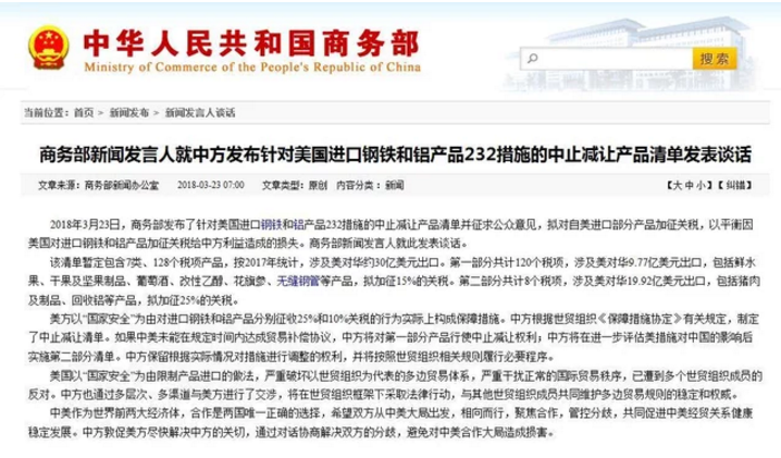 2018年3月23日,商务部发布了针对美国进口钢铁和铝产品232措施的中止减让产品清单并征求公众意见,拟对自美进口部分产品加征关税,以平衡因美国对进口钢铁和铝产品加征关税给中方利益造成的损失。商务部新闻发言人就此发表谈话。