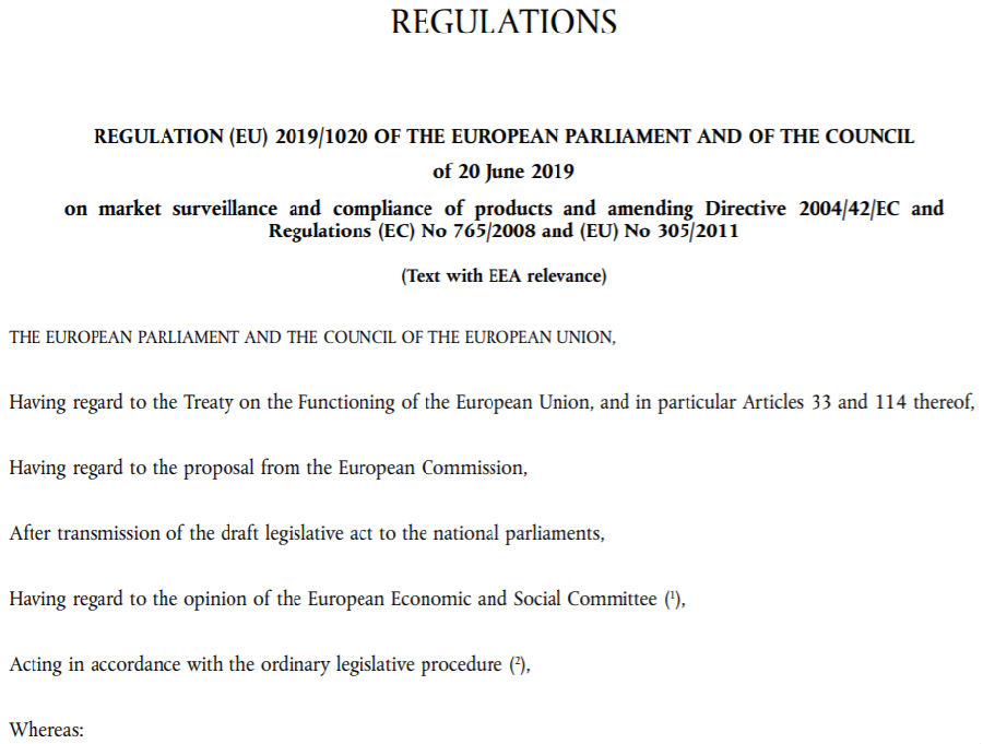 欧盟议会和理事会于2019年6月20日批准了一项新的欧盟法规EU2019/1020,该法规将于2021年7月16号正式开始实施。新法规实施后,所有进入欧盟的市场的消费品(新法规附件1所列的71个法令所覆盖的产品)都需要有欧盟境内的经济运营者(法规中称为“Economic Operator”)作为商品合规的负责人,如果没有指定的负责人,将被视为不合规,商品将不能正常进入欧盟市场。