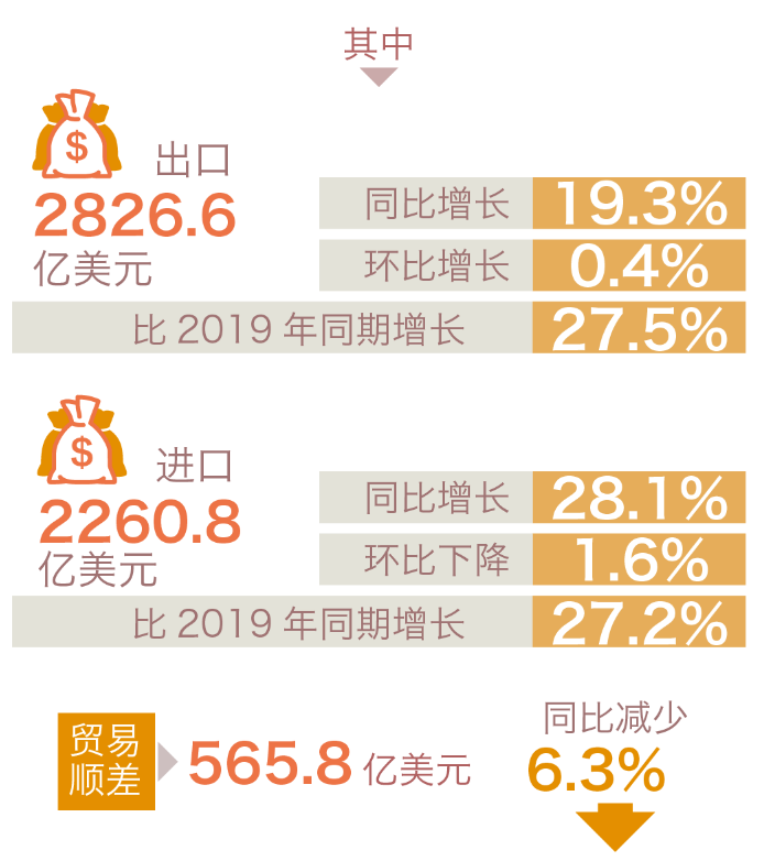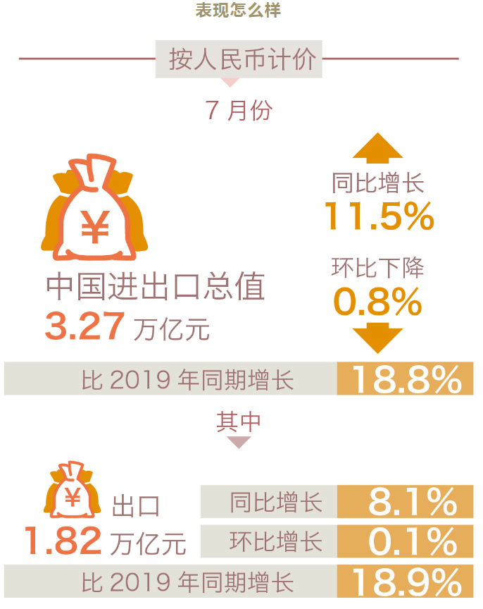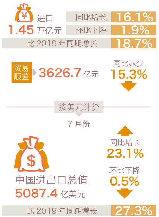 今年前7个月,我国进出口总值21.34万亿元,同比增长24.5%,比2019年同期增长22.3%。按月来看,进出口同比增速已连续保持14个月的正增长,7月份同比增长达11.5%,但环比由6月份的增长5%滑落至下降0.8%。