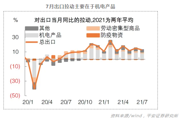 根据平安首经团队《2021年7月外贸数据点评》(为剔除去年基数变化的影响,其采用了两年平均增速来分析出口的产品结构和区域结构),分产品来看,7月机电产品仍是当前出口的主要贡献项,对出口的拉动从6月的9.4%下滑到8.5%;劳动密集型产品对出口的拉动从1.8%下降到1.5%,防疫物资对出口的拉动从0.7%下降到0.3%,钢材对出口的拉动从0.9%降低到0.6%,除上述产品外的其他产品对出口的拉动从3.2%下滑到2.6%。海外复工复产推进后,中国面临的外需环境在整体收缩。
