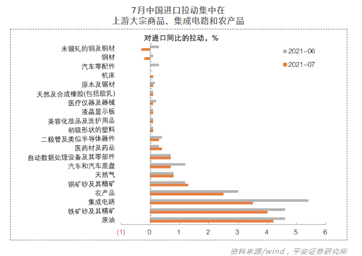 同样采用两年平均增速分析进口的产品结构。7月中国进口的两年平均增速为12.8%,较6月的18.8%明显回落,但仍处于疫情后的较高水平。