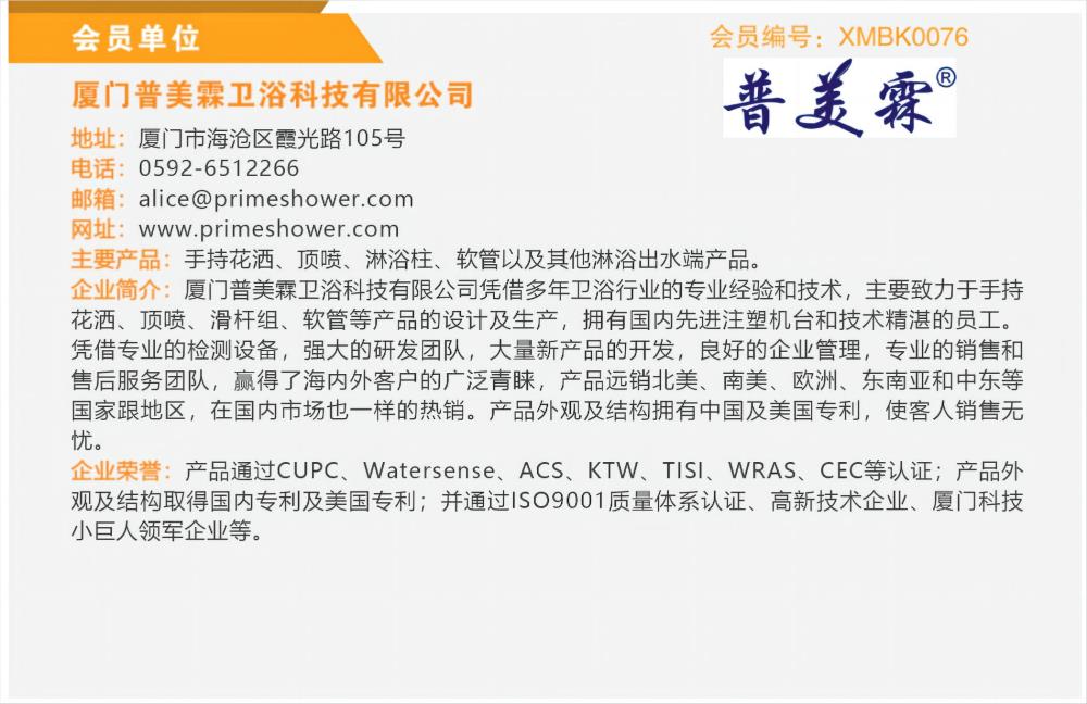 厦门普美霖卫浴科技有限公司凭借多年卫浴行业的专业经验和技术,主要致力于手持花洒、顶喷、滑杆组、软管等产品的设计及生产,拥有国内先进注塑机台和技术精湛的员工。专业的检测设备,强大的研发团队,大量新产品的开发,良好的企业管理,专业的销售和售后服务团队,赢得了海内外客户的广泛亲睐,产品远销北美、南美、欧洲、东南亚和中东等国家跟地区,在国内市场也一样的热销。产品外观及结构拥有中国及美国专利使客人销售无忧。