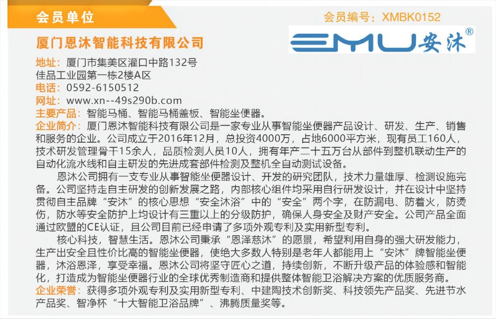 核心科技,智慧生活。恩沐公司秉承“恩泽慈沐”的愿景,希望利用自身的强大研发能力,生产出安全且性价比高的智能坐便器,使绝大多数人特别是老年人都能用上“安沐”牌智能坐便器,沐浴恩泽,享受幸福。恩沐公司将坚守匠心之道,持续创新,不断升级产品的体验感和智能化,打造成为智能坐便器行业的全球优秀制造商和提供整体智能卫浴解决方案的优质服务商。