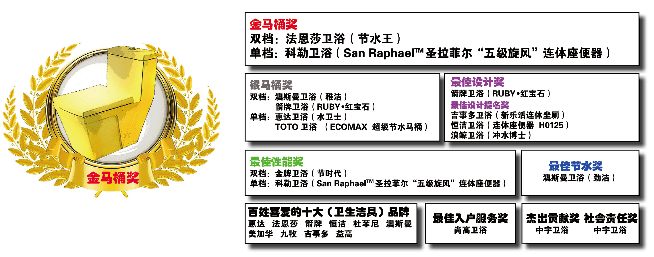 本次“金马桶”系列奖项的评选,是目前中国卫生洁具行业规模最大、规格最高的一次冠军品质检阅,它几乎攘括了目前国际国内最具代表性的卫浴品牌群体,来自海外的百年品牌和国内的民族品牌都送检了当年的最新产品,这些产品几乎代表了中国卫生洁具市场上的最高水平。评价方法是建立在“2010年中国卫生洁具测评”专业测评基础上,通过4个月的网络投票和6场大型社区落地活动现场的老百姓填写投票,在12月7日专家组的综合评审下产生。从专业测评分值、企业综合实力、企业品牌知名度及产品销量、产品外观设计及使用功能性、百姓投票分值等方面进行客观公正的评价。从评价结果中看出“金马桶”的获得者是产品性能、终端影响力、外观设计的兼具者,通过此次活动希望能促使企业全方位发展。具体结果如下: 节能环保、智能化是将来卫生洁具的主流方向,目前,在中国市场沉淀三十载的民族品牌处于厚积薄发之势,创新意识逐渐增强,生产技术日臻完善。为响应政府节能环保(节水)号召,为广大甲方、消费者、装饰设计和施工企业选择卫生洁具提供真实可靠的消费指导。中国建筑装饰协会工程委员联合国家建筑卫生陶瓷质量监督检验中心在2009年全国卫生洁具测评工作的基础上,广泛征求行业内专家和企业意见,完善测评方案,继续举办“2010年中国卫生洁具测评”。国家建筑卫生陶瓷质量监督检验中心制定了一套高于国家标准的测评方案,由中国建筑装饰协会厨卫工程委员会组织在中国市场上销售的国际国内品牌参与本次测评活动。最终,有30个企业的42款马桶在严格的测评体系中脱颖而出,同时编辑《中国建筑装饰行业卫生洁具产品采购名录暨中国卫生洁具测评报告》,向广大甲方、消费者、装饰设计和施工企业做推荐。 在终端方面,“万家节水,一马当先”2010年北京城市服务管理广播“中宇万家节水改造”公益行动暨中国节水(洁具)“金马桶”奖评选自今年8月25日启动,组委会走进高家园社区、厂洼社区、永善社区、六街坊西社区、上地华联商场,历时四个月。在本次“中宇万家节水改造”公益行动中共有6000余名百姓报名参与了节水改造活动,组委会将申报信息进行了整理与确认,定期安排着统一服装、配带专门证件的维修服务团队深入居民家中,根据填写的报名信息挨家挨户进行服务,为百姓进行马桶用水量免费检测,提供改进“跑、冒、滴、漏”现象的维修服务及建议,让百姓直接便利地享受到了高效节水改造服务。与此同时,大力宣传倡导市民使用节水洁具,力争从根本上消除马桶过度消耗水资源的顽疾。 |
