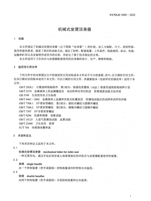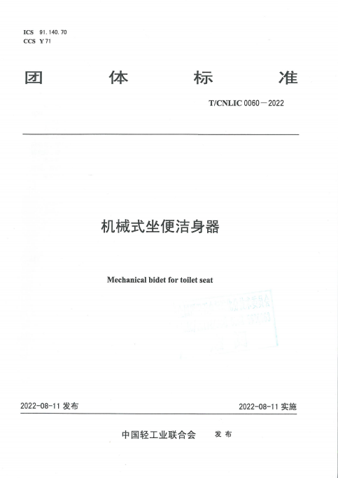 2022年8月11日,T/CNLIC 0060-2022 机械式坐便洁身器 团体标准发布,可点击文末获得标准全文。