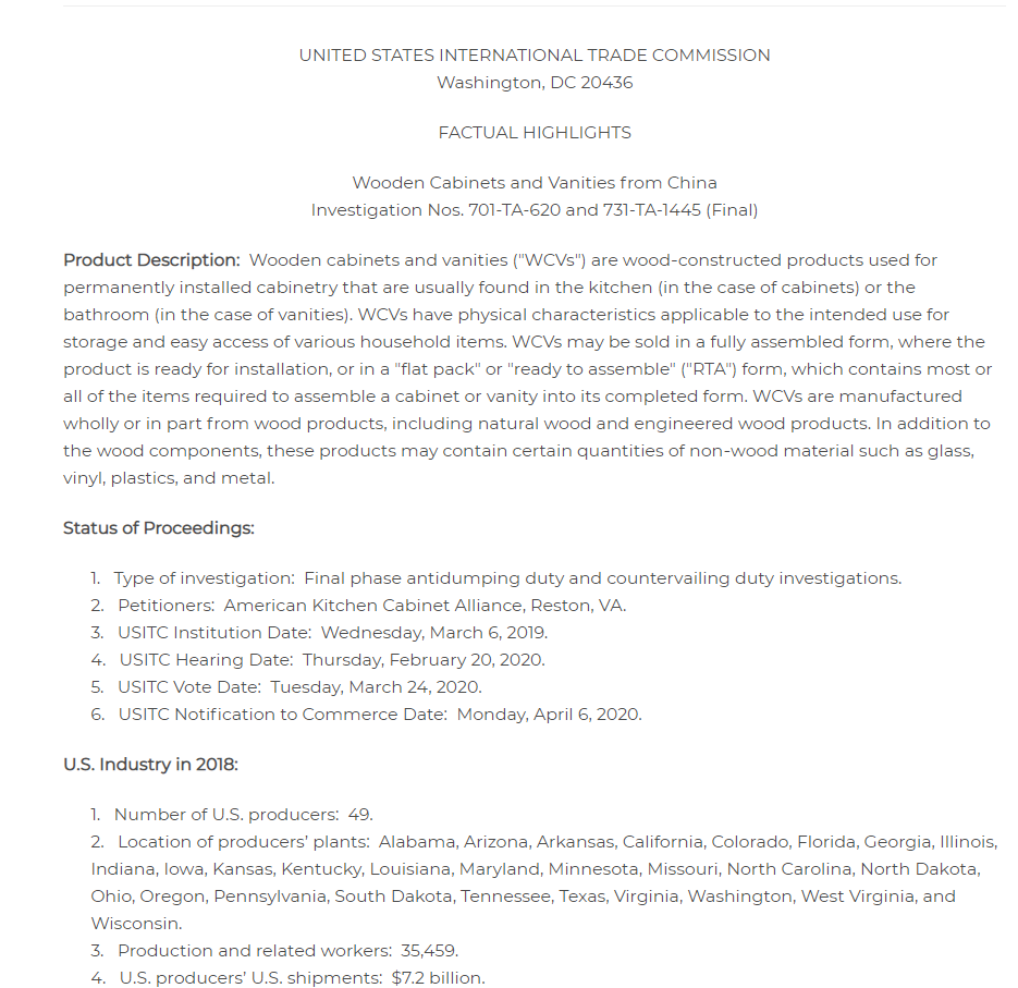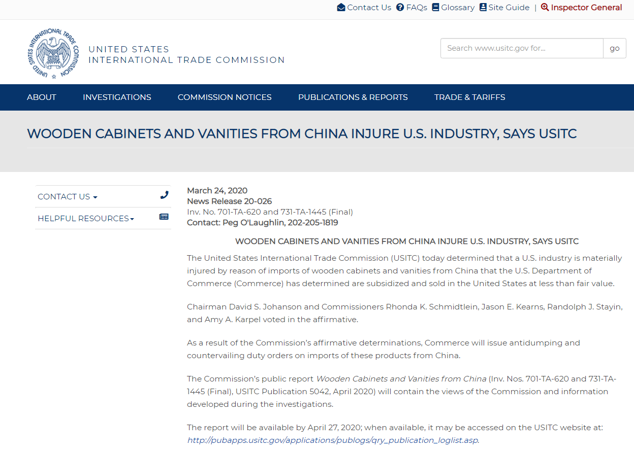 3月24日,美国国际贸易委员会(USITC)以5:0投票对中国的木柜和浴室柜“双反”损害调查作出肯定性终裁,认为进口产品对美国产业造成“实质损害”。https://www.usitc.gov/press_room/news_release/2020/er0324ll1458.htm