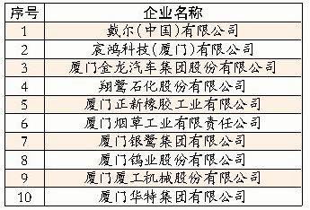 [1] “2013厦门制造业企业十强”入围企业分别是:戴尔、宸鸿科技、金龙汽车、翔鹭石化、正新橡胶、厦烟工业、银鹭集团、厦门钨业、厦工机械、华特集团。其中,金龙汽车、厦工机械、华特集团等3家为新入榜企业。在制造业企业十强中,国有及国有控股企业4家(去年5家),外资企业4家(去年4家),私营企业2家(去年1家)。营业收入达100亿元以上的企业有7家(去年6家),戴尔(中国)有限公司以359.50亿元的营业收入荣登“厦门制造业企业十强”榜首。