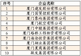 [2] “2013厦门服务业企业十强”入围企业分别是:建发股份、国贸控股、象屿集团、厦门航空、中骏集团、路桥物资、海投集团、翔业集团、夏商集团、联发集团。其中联发集团为新入榜企业。在服务业企业十强中,国有及国有控股企业9家,外资企业1家,所占比例与去年基本相似。营业收入达100亿元以上的企业有4家(去年5家),厦门建发股份有限公司以911.67亿元的营业收入连续4年蝉联“厦门服务业企业十强”榜首。