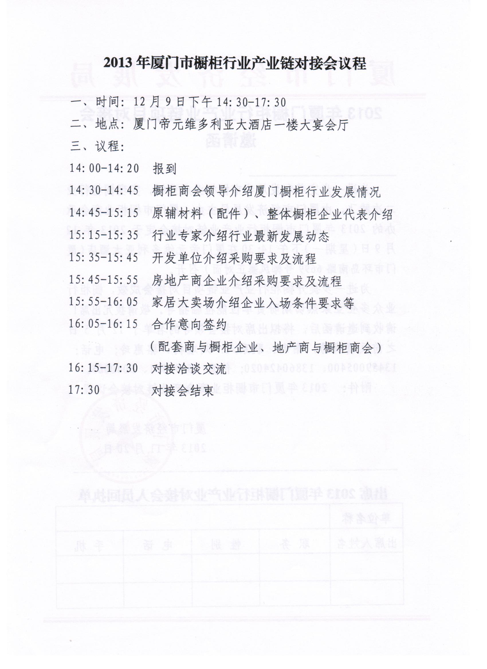 为进一步完善和发展我市橱柜业产业链,实现橱柜行业二次腾飞,由厦门市经济发展局主办、厦门市橱柜业商会承办的2013年厦门市橱柜行业产业链对接会定于2013年12月9日(星期一)下午14:30在厦门帝元维多利亚大酒店(厦门市环岛南路6699号椰风寨正对面)召开。
